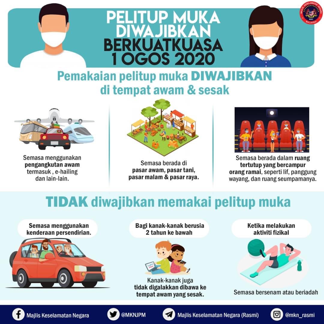 Pemakaian pelitup muka akan diwajibkan bermula 1 Ogos di kawasan sesak seperti pengangkutan awam serta tempat-tempat awam. Situasi Terkini COVID-19 di Malaysia 31 OGOS 2021. Difahamkan ia berkaitan dengan arahan pemakaian pelitup muka di tempat awam yang diwajibkan sejak 1 Ogos 2020.